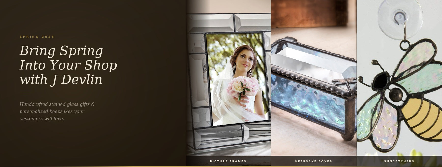 J Devlin designs today include a broad and unique line of items including picture frames, lamps, keepsake boxes, night lights, ornaments, kaleidoscopes and trays. Each item is carefully handcrafted by skilled artisans using a copper foil and solder technique developed by Louis Comfort Tiffany in the late 1800’s. This age-old art form combined with 21st century designs creates the perfect combination for unique home décor.