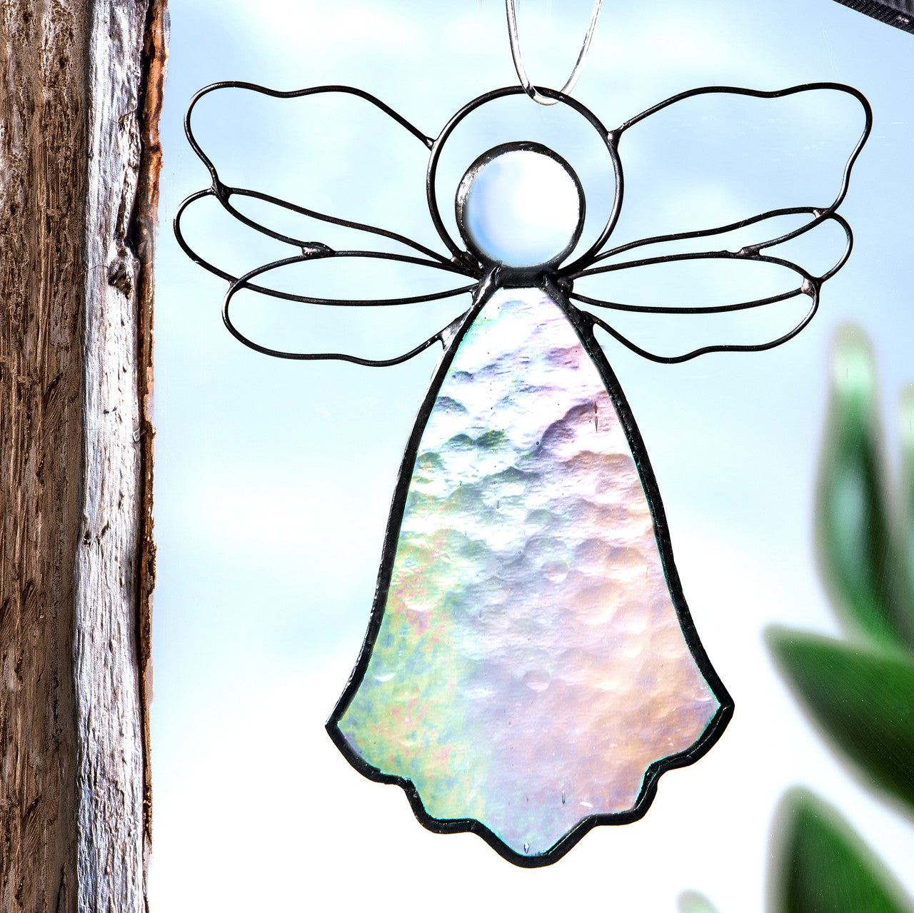 Bring attention to any window with this stained glass angel ornament from J Devlin. A sign of peace and hope the soft rippled texture in the glass and the delicate wings will make her the perfect angel for your Christmas decorating. Just don’t put her away after the holidays she’s perfect all year round displayed as a window sun catcher with the suction cup that is included.