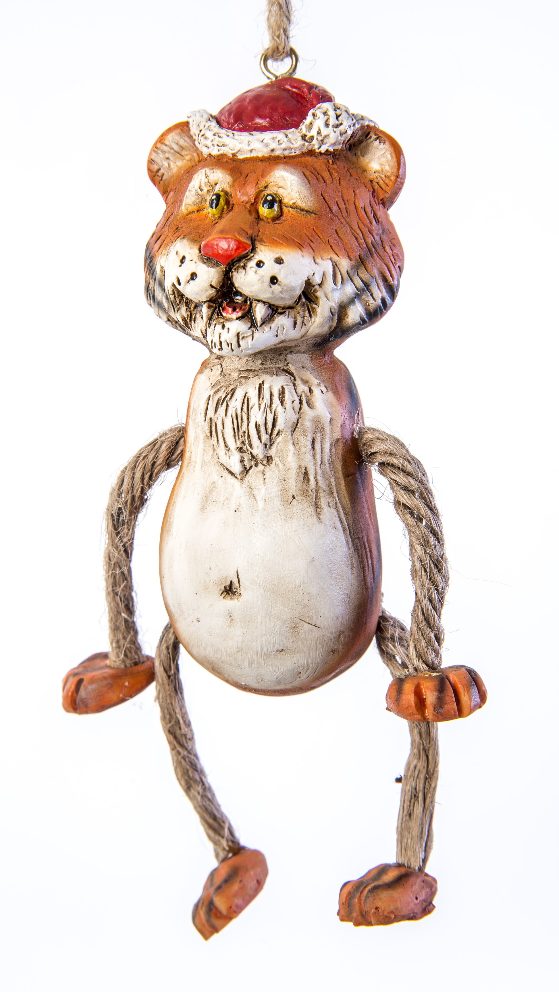 Full of festive spirit and wild charm, this cheerful tiger is ready to pounce into the holidays! Wearing a bright Christmas stocking hat and featuring the playful detail you expect from a Bert Anderson original, this resin ornament hangs from a natural jute rope. A perfect keepsake for zoo gift shops, safari lodges, or anyone who loves a little Christmas adventure. (Approx. 5" tall, not including hanger.)