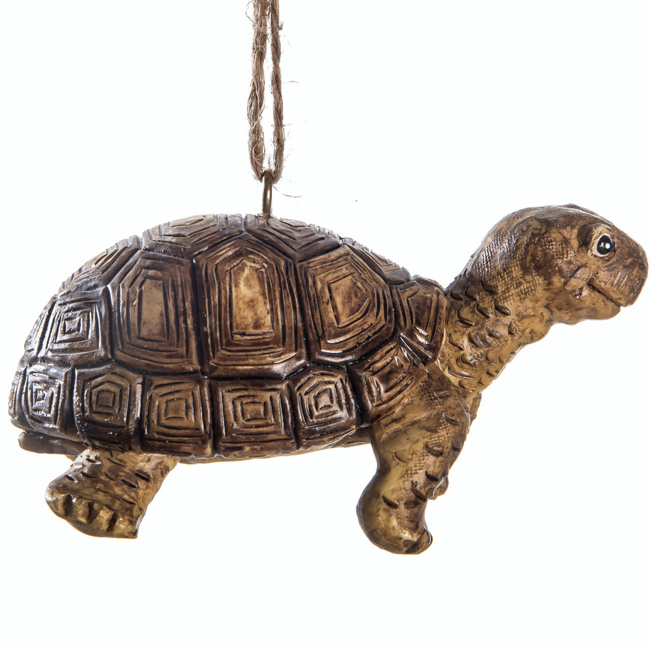 This ornament is expertly crafted by skilled artisans using high-quality resin, and features intricate details that make it look like a real tortoise. Measuring at approximately 2.25 inches tall, this ornament is the perfect size to add to your Christmas tree, wreath or any other festive display. Plus, it comes with a natural jute roping as a hanger, adding an extra touch of rustic appeal to your decor.