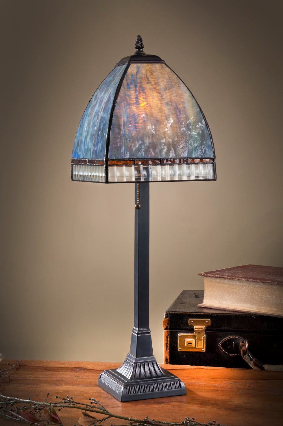 The mission style lamp base with pull chain switch is the perfect compliment to this shade.