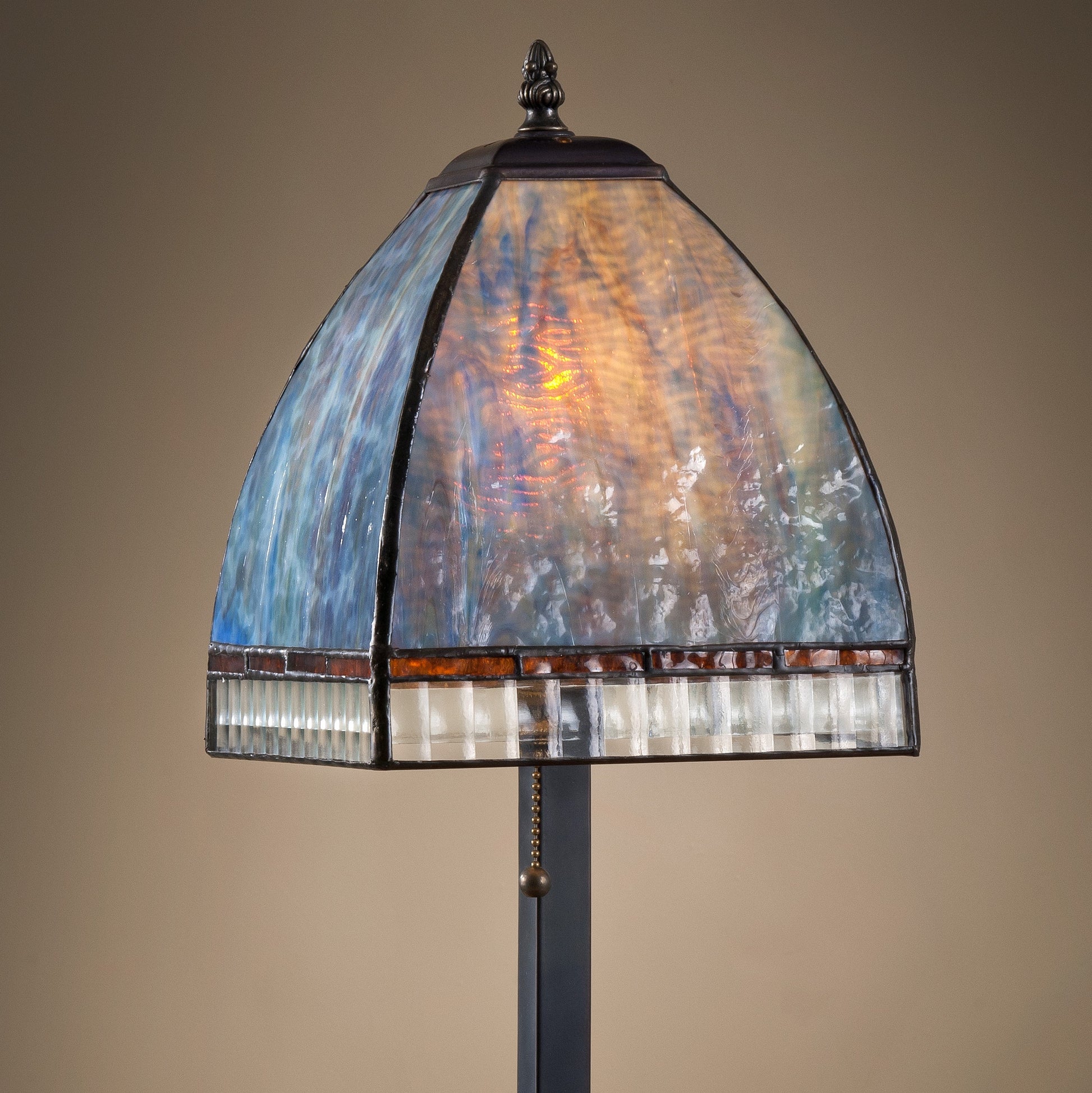 A certain tasteful elegance defines this lamp. The subtle mixture of blue, purple, and amber is reminiscent of colors from a Monet painting. As a focal point in your study, an accent light in your entryway, or a conversation piece in your favorite reading spot. Everyone has room in their home to make an artistic statement with a stunning piece of Tiffany-styled glass art like this.