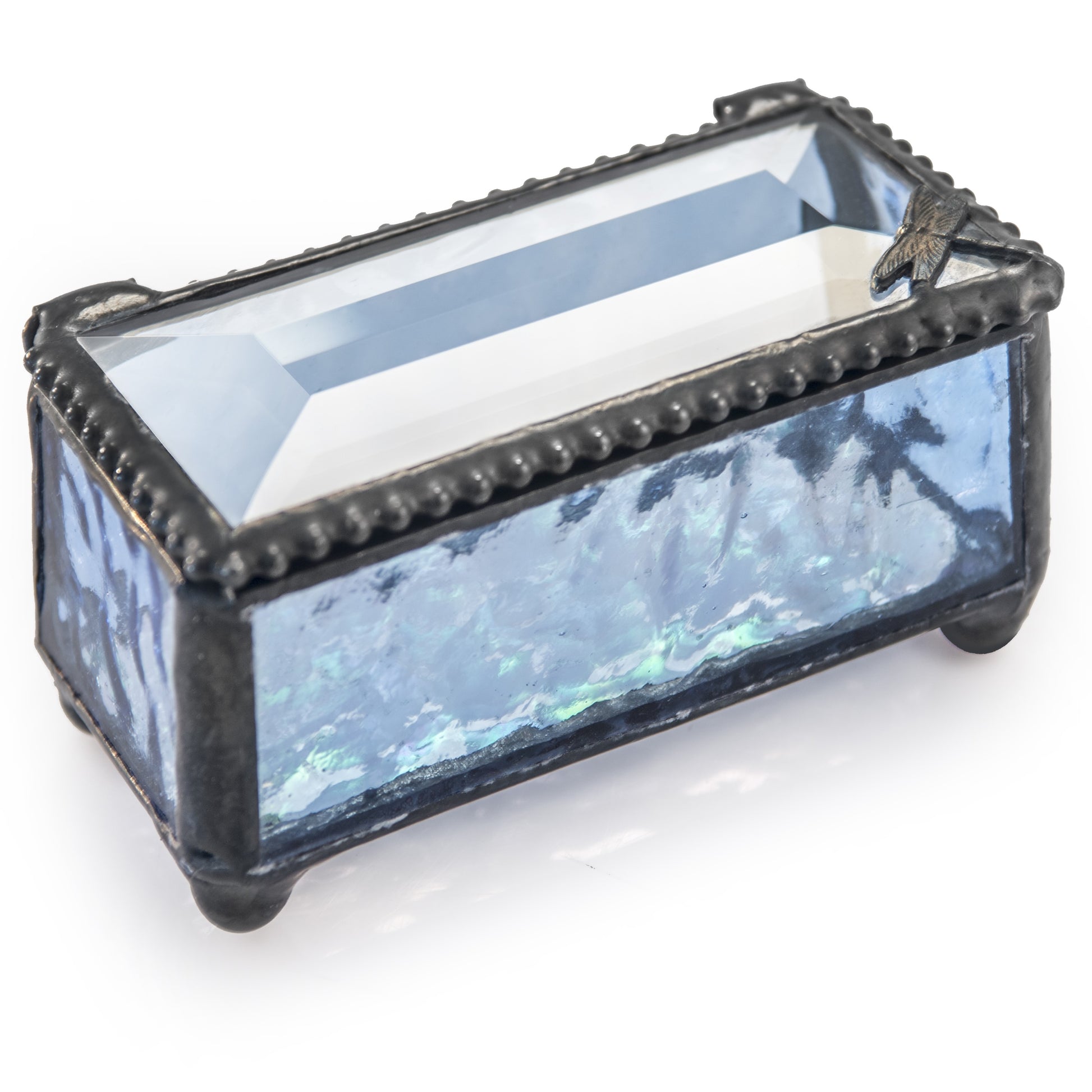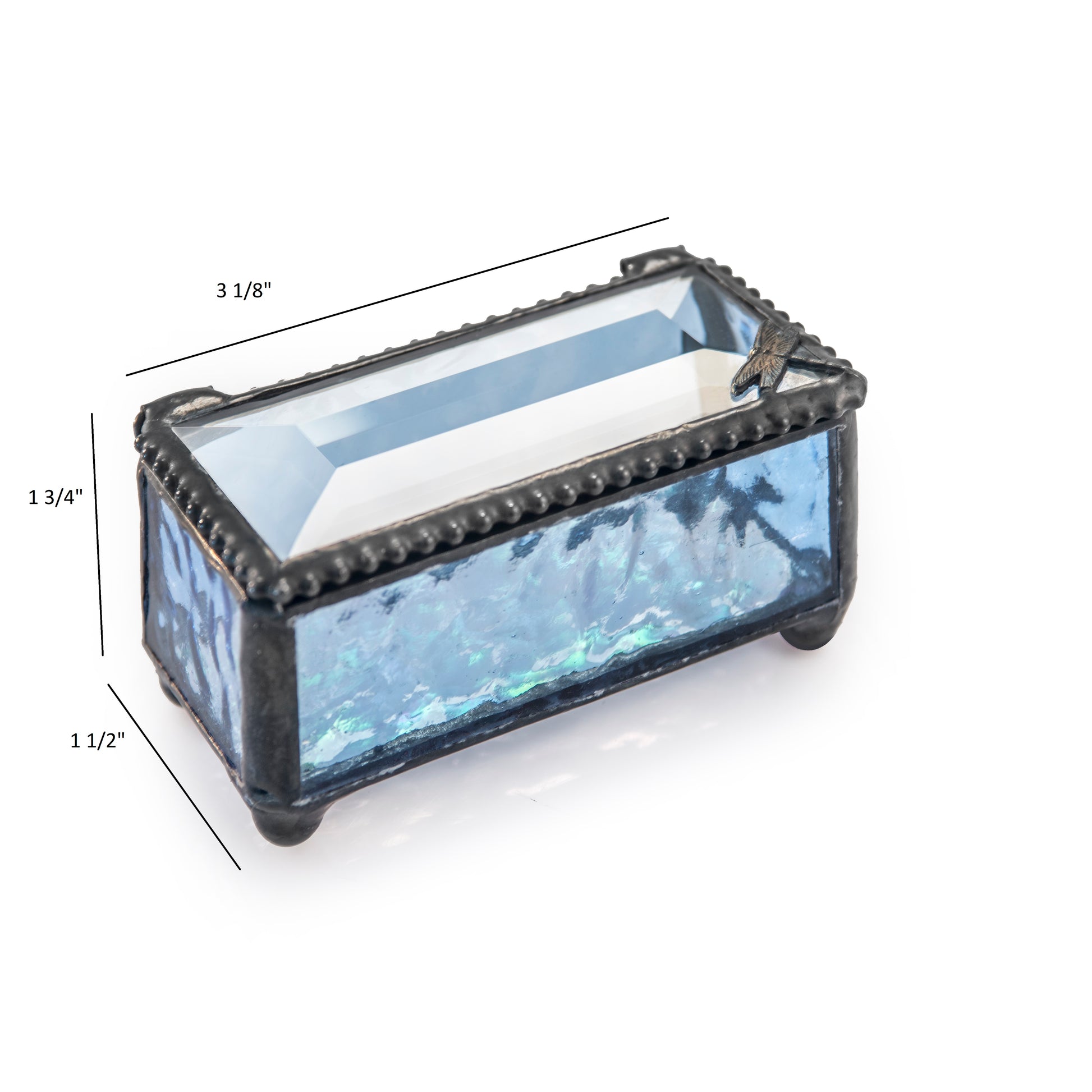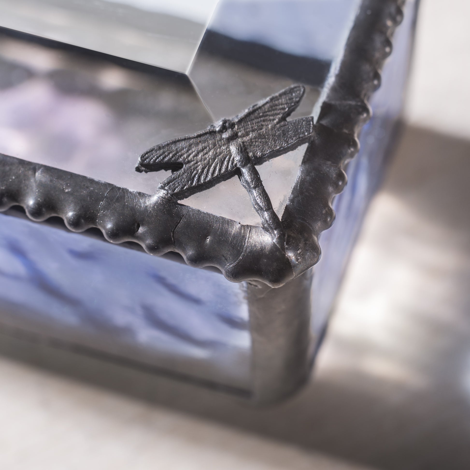 This small blue stained glass box features a delicate dragonfly filigree in the corner.