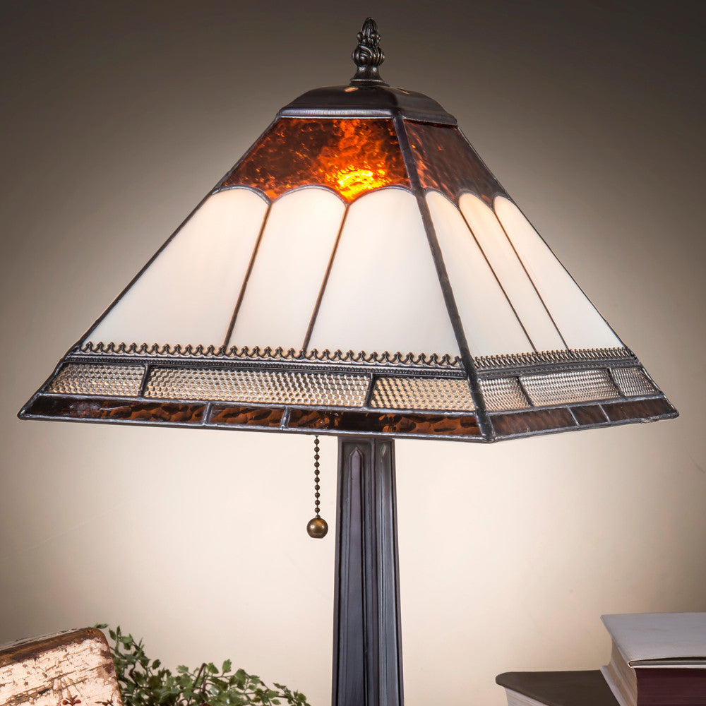 This Mission style stained glass lamp features larger panels of ivory opalescent complemented by translucent chocolate brown. Clear honeycomb glass trim and metal filigree add to the craftsman style of this table lamp.