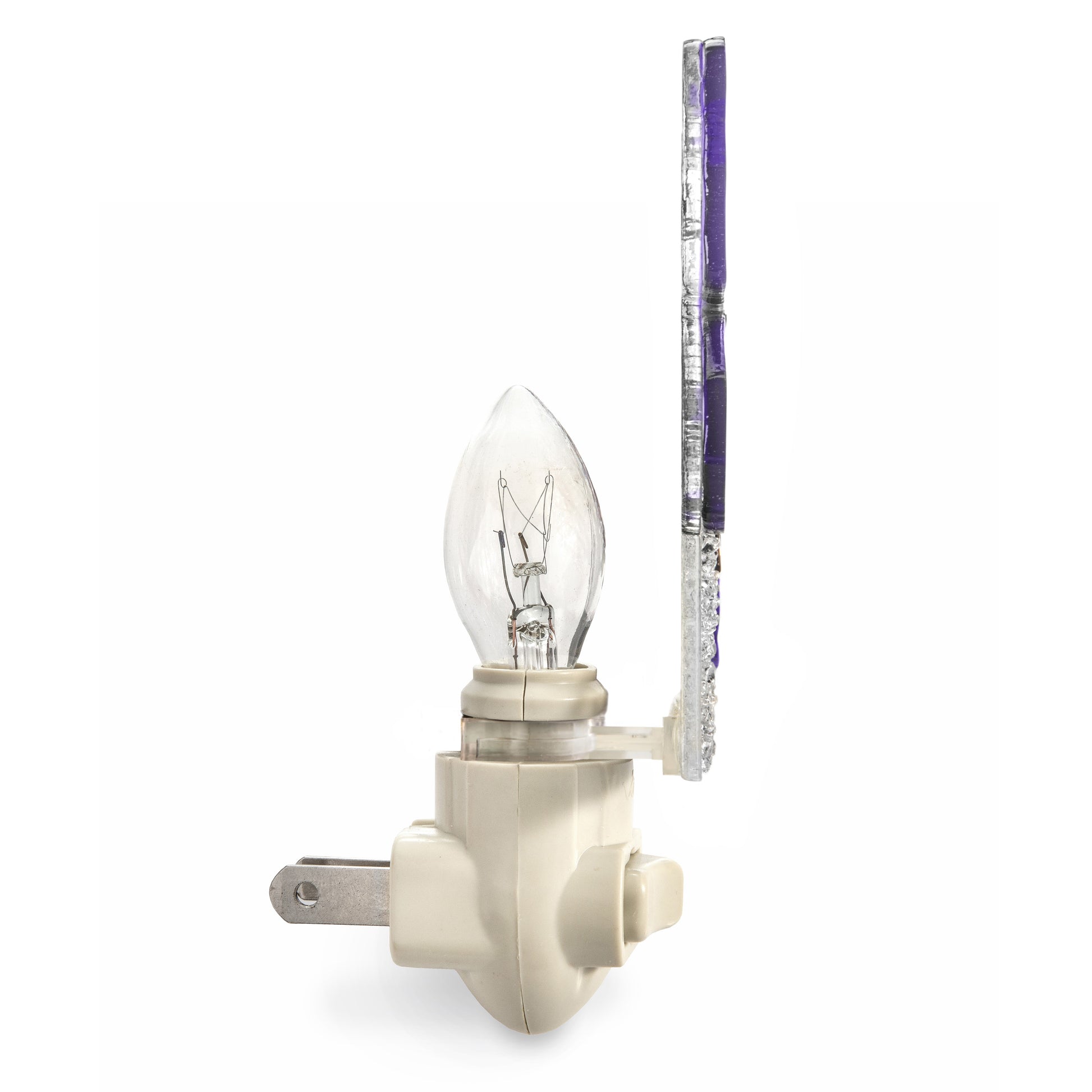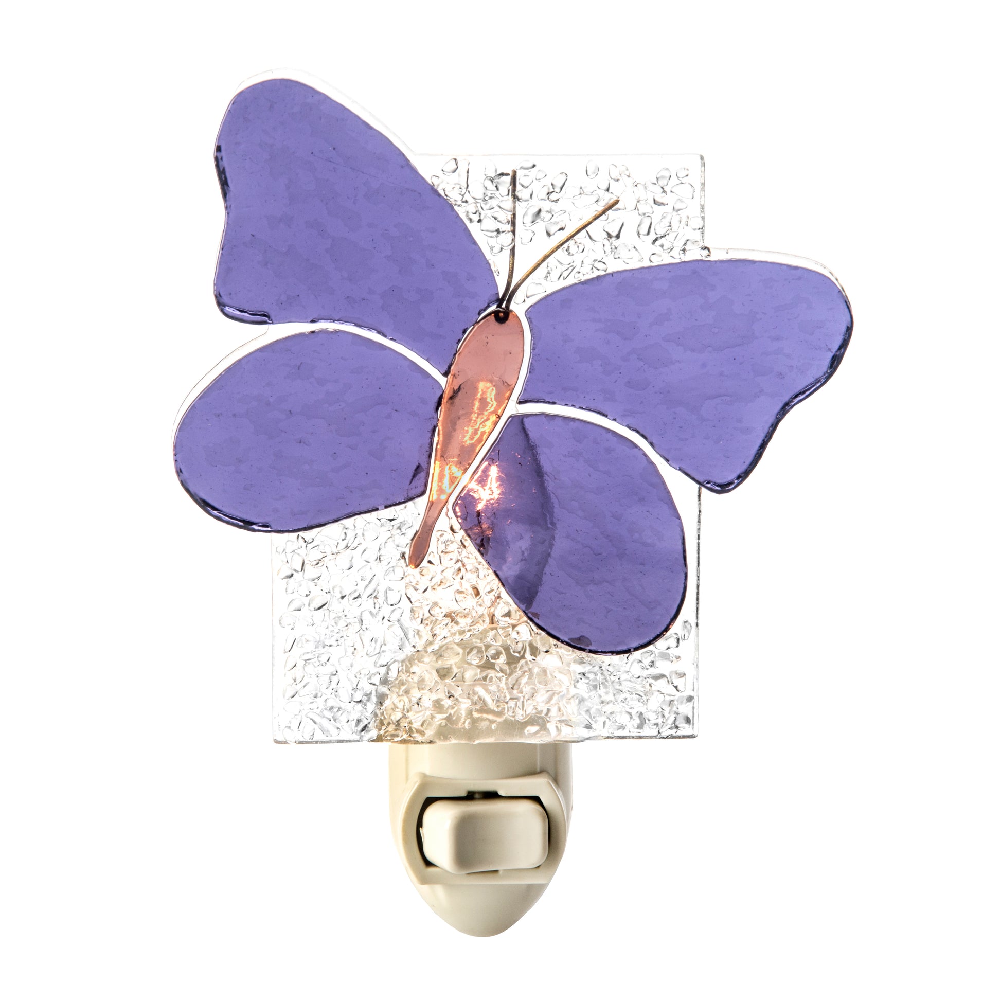 Each fused glass night light is created by skilled artisans who meticulously cut and arrange the pieces of stained glass. The colorful pieces are then fired in a kiln softening the edges and forming a permanent bond between the layers.