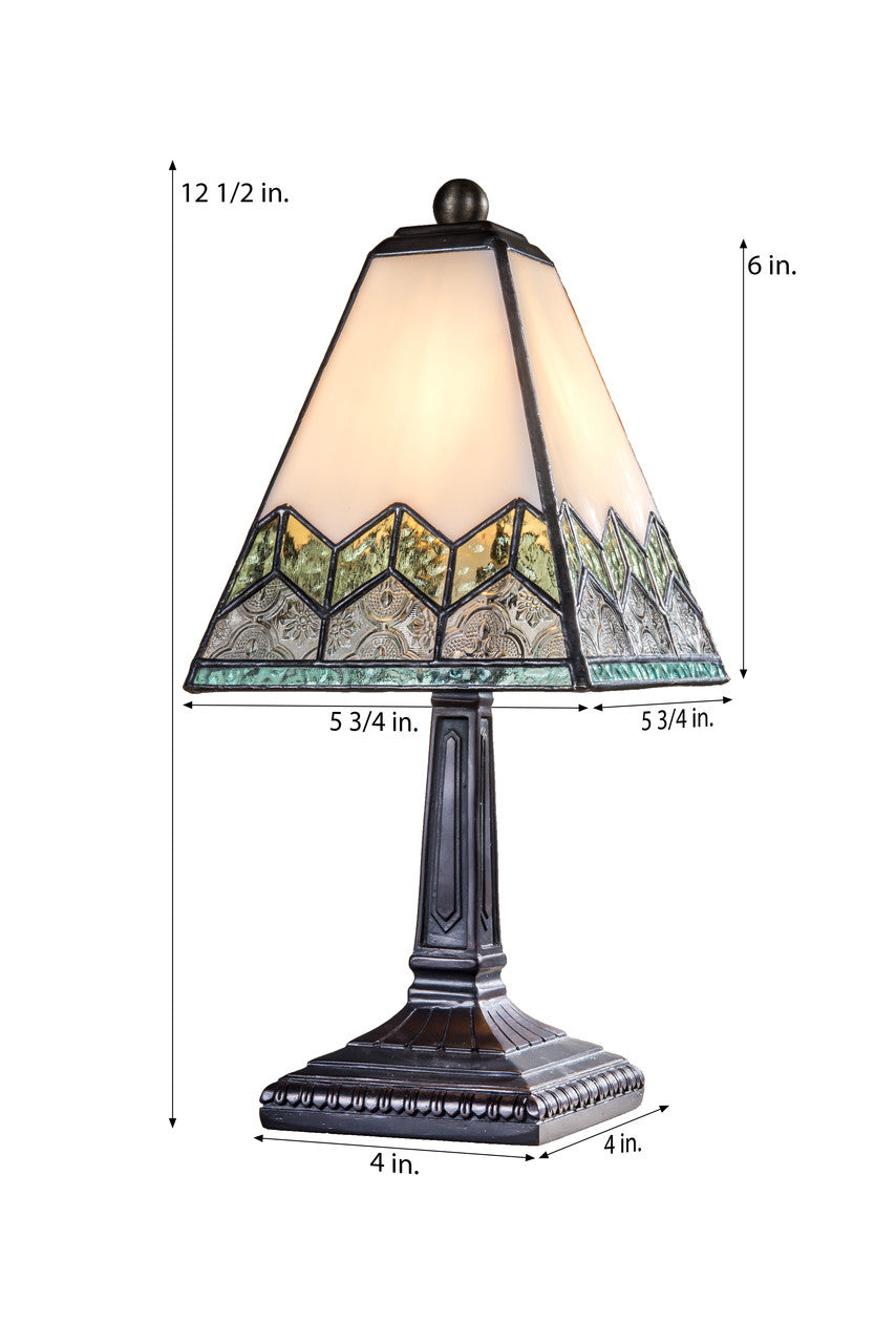 Playful and colorful, this stained glass table lamp features a unique chevron design. Small in stature but big on style this Tiffany styled accent lamp will brighten dark corners.