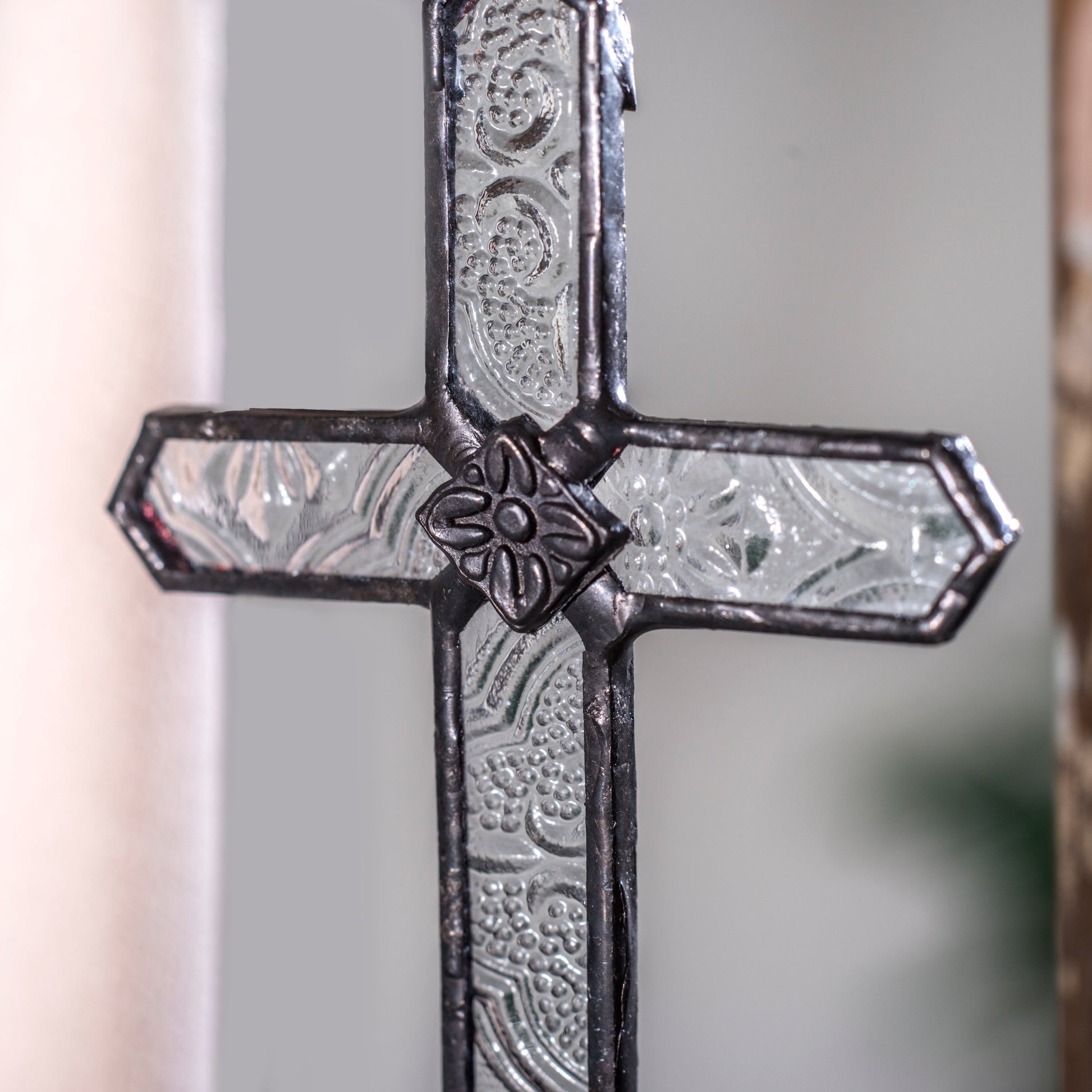 Featuring textured glass reminiscent of that used in old Victorian windows with a metal filigree flower in the center. For yourself or as a gift for a special religious celebration, this hanging cross is sure to make an immediate impression on all who see it..