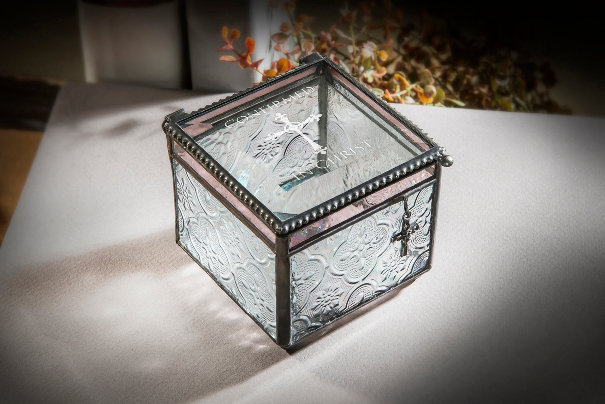 This vintage stained glass keepsake box engraved with the words "Confirmed in Christ" makes a truly meaningful and timeless Confirmation gift. The Christian cross charm represents faith and the significance of the baptismal sacrament.