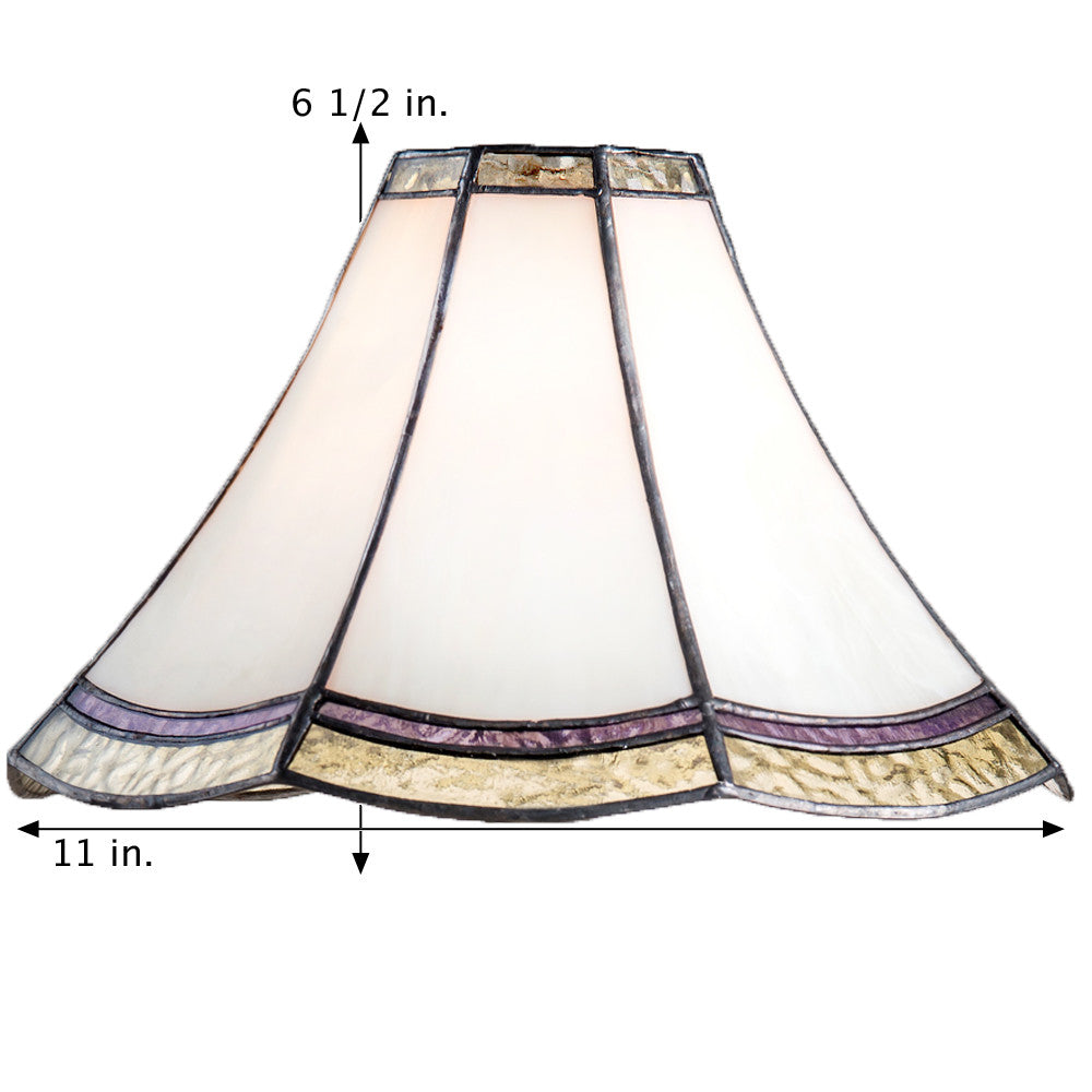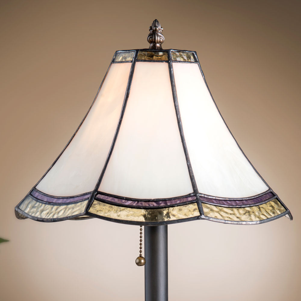 After seeing this elegant stained glass table lamp from J. Devlin, you'll understand why this unique glass was popular in cathedral windows over a century ago. Its shade features large curved pieces of ivory opalescent glass trimmed with translucent purple and pale green.