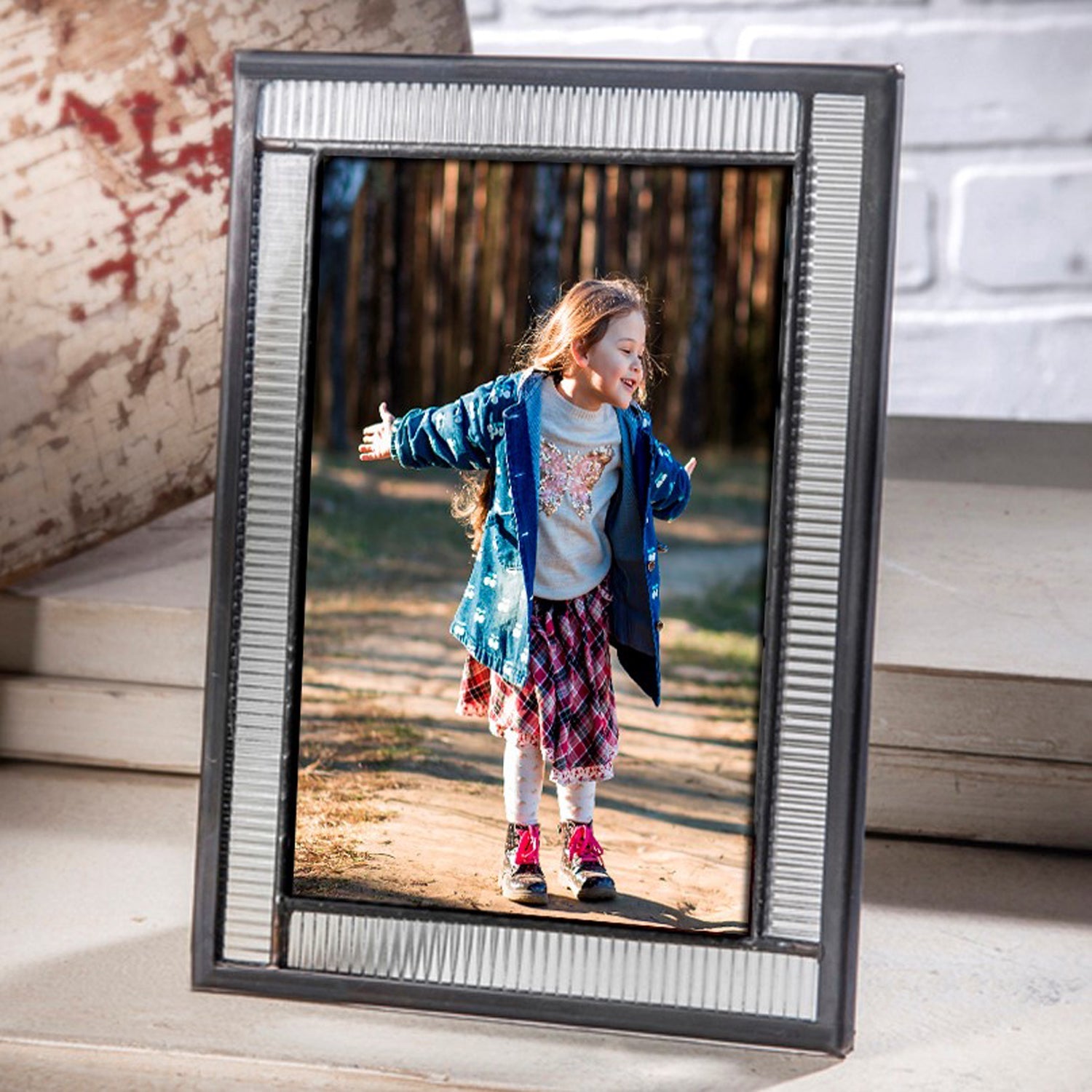 This J Devlin picture frame is designed using narrow pieces of clear flute textured glass with a simple metal border. Modern mixed with traditional it will compliment any home or office décor. A style both men and women will love. Add a cherished photo and this frame will make the ideal keepsake gift for a baby, graduation or wedding anniversary. A gift for a someone special or as an addition to your own home décor. Coordinating pieces and additional sizes are available and look stunning paired together. Each picture frame is carefully handcrafted by skilled artisans using a copper foil and solder technique developed by Louis Comfort Tiffany in the late 1800’s