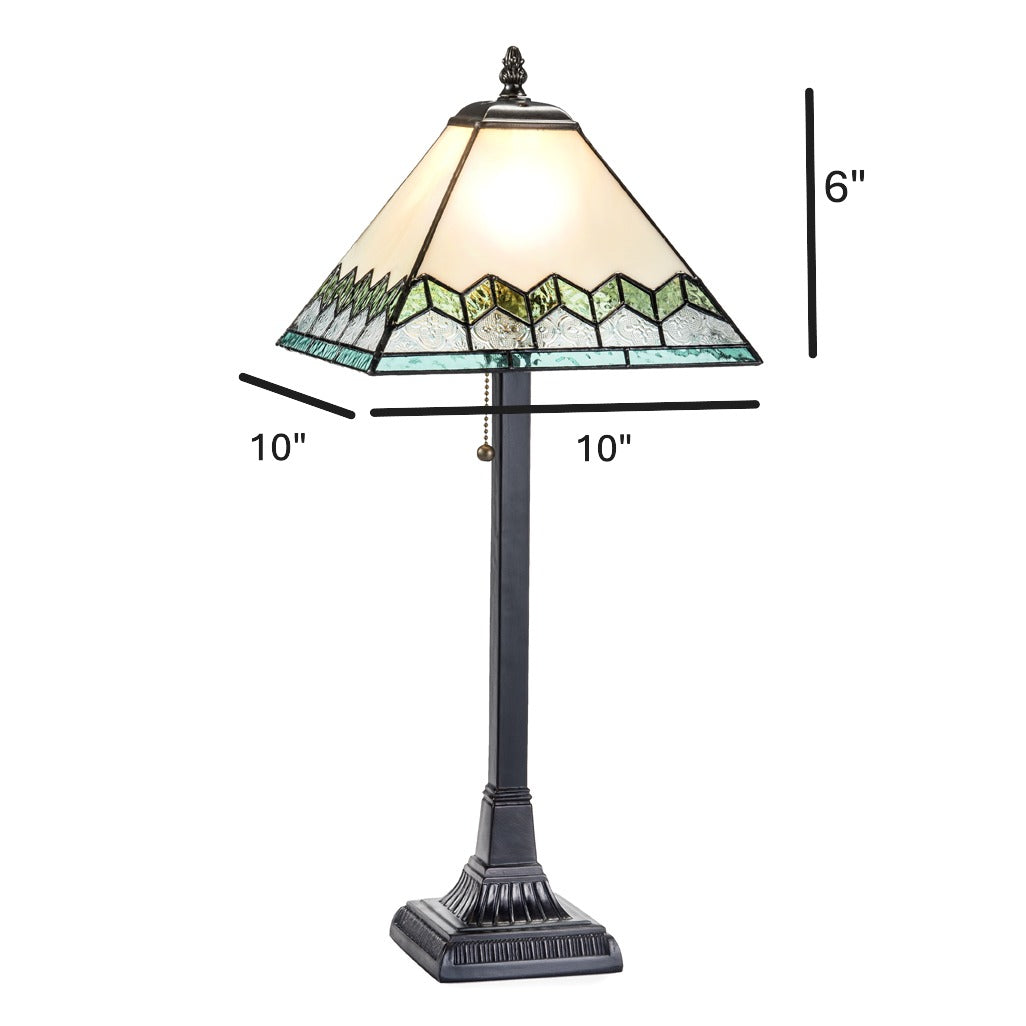 Combining a clear vintage and a soft pale green stained glass in a chevron pattern creates a style that is unique and fun. Add an artistic statement to a desk or table with this Tiffany styled lamp by J Devlin.