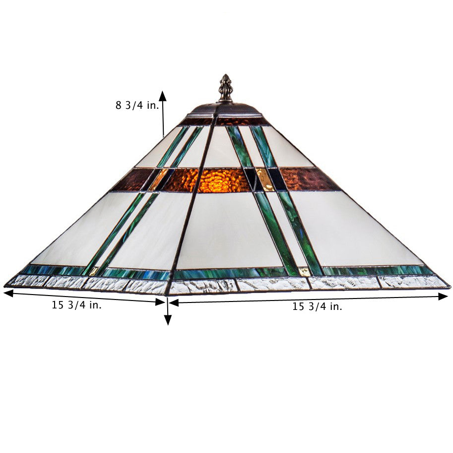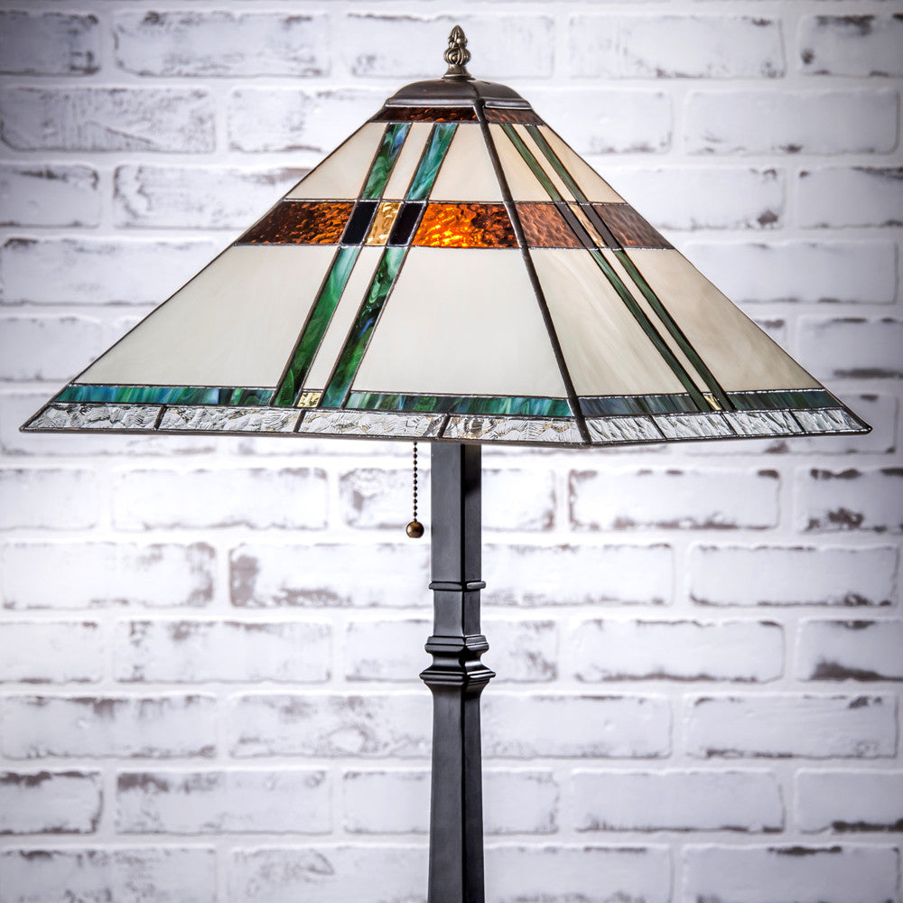 This classic design features larger panels of ivory opal stained glass complemented by a rich brown cathedral glass. Accents of dark blue and green/brown stained glass further add to the sophistication and interest of this glass table lamp. Each lamp is carefully handcrafted by skilled artisans using a copper foil and solder technique developed by Louis Comfort Tiffany in the late 1800’s. This age-old art form combined with 21st century designs creates the perfect combination for unique home décor.