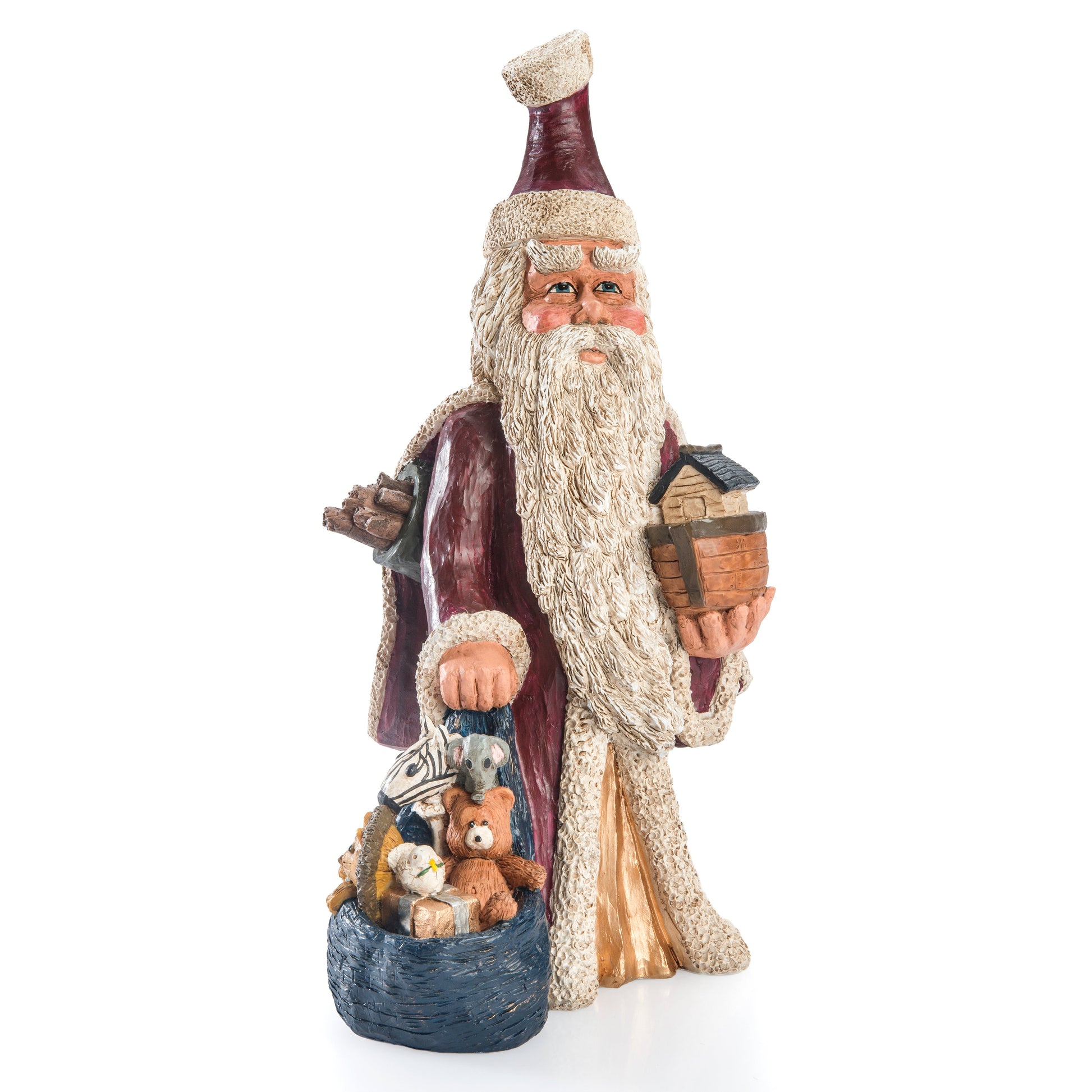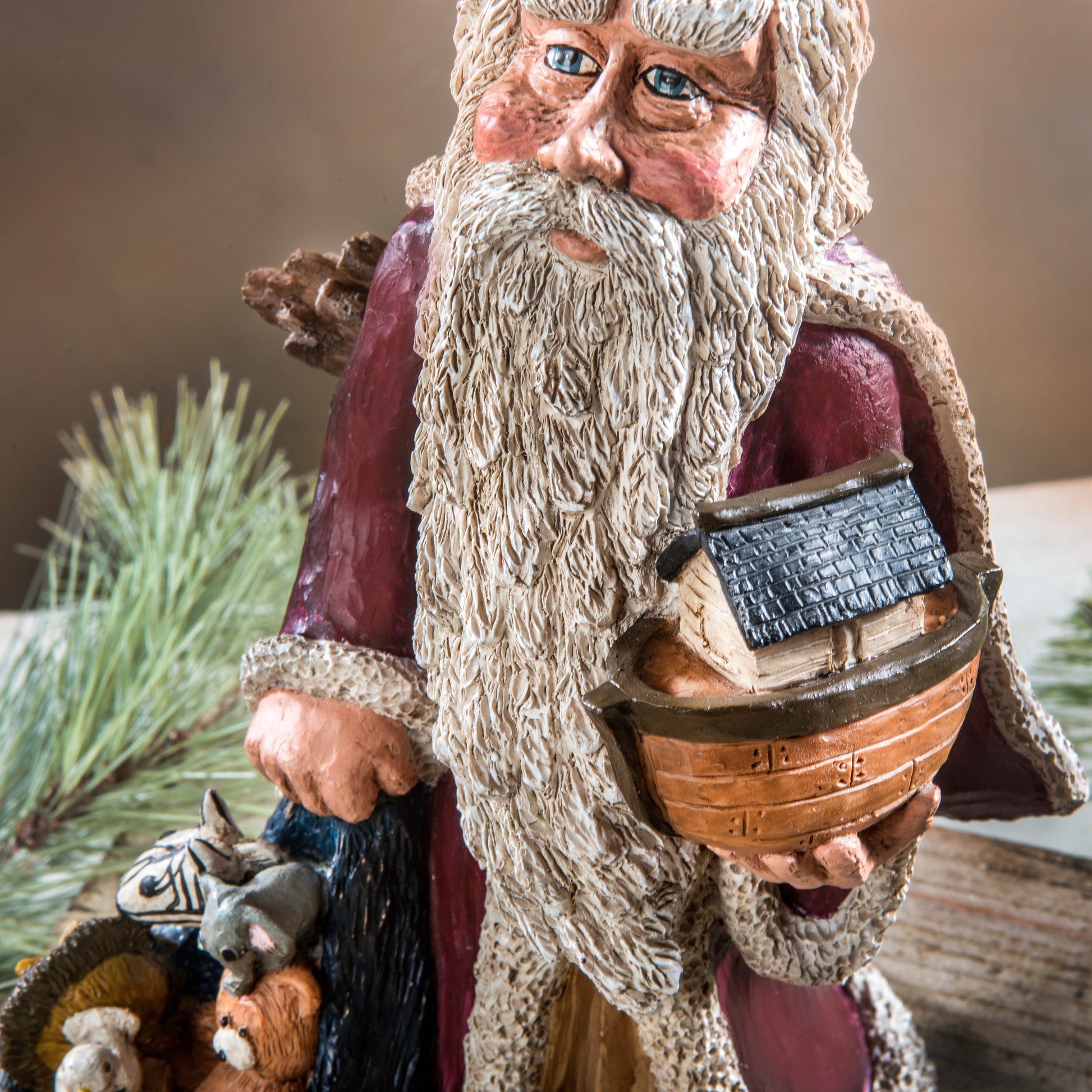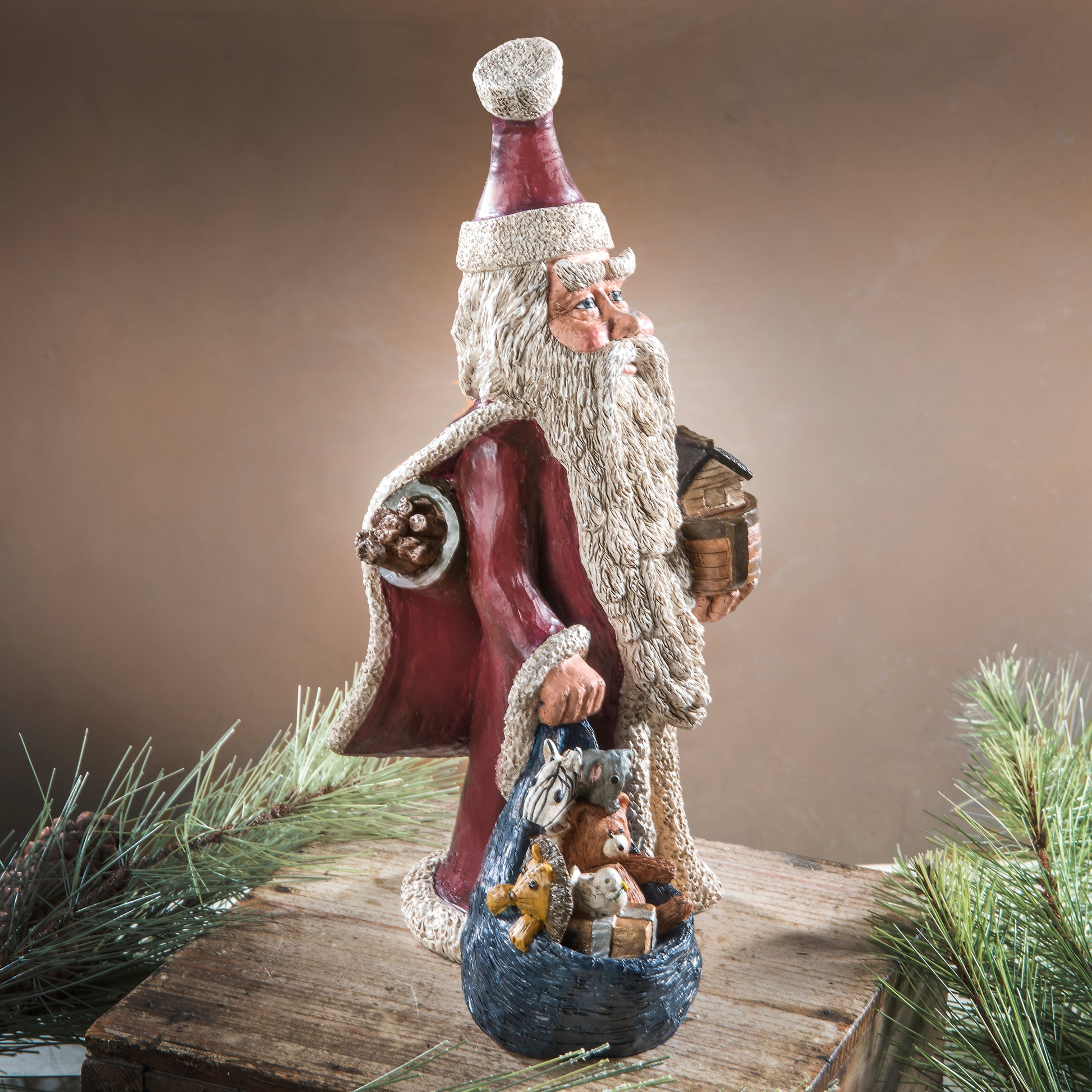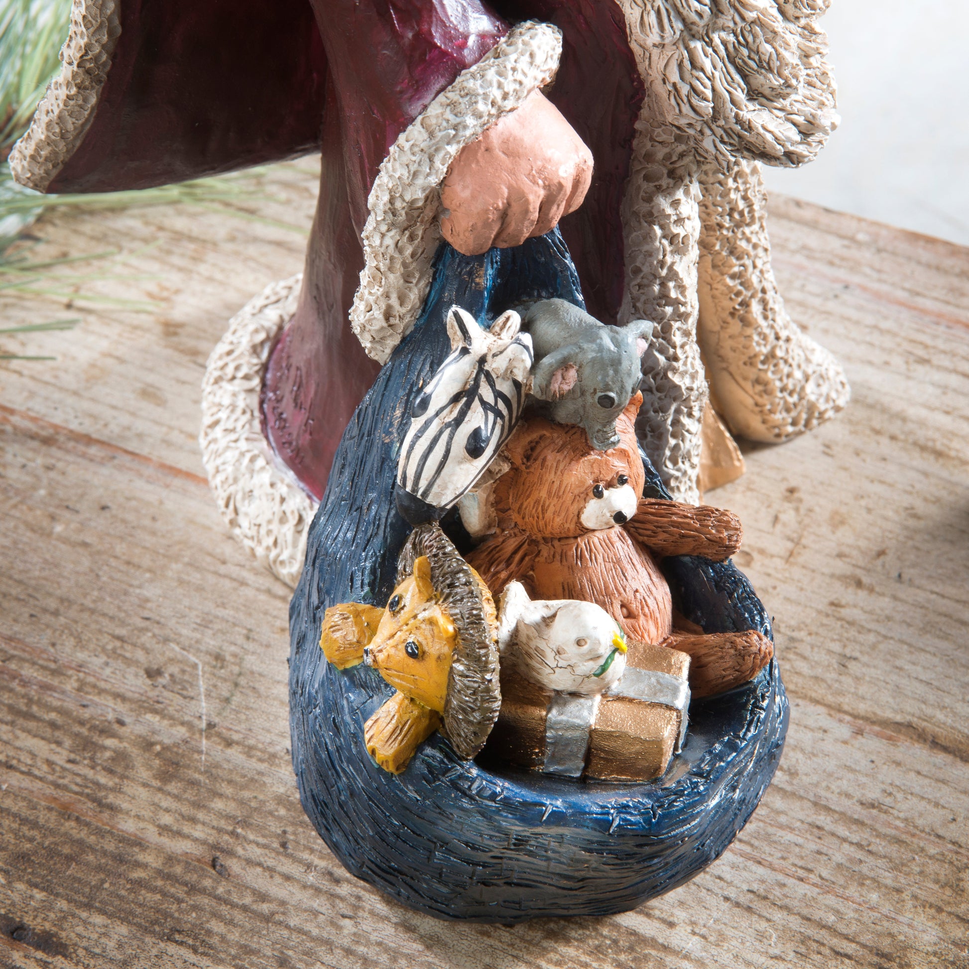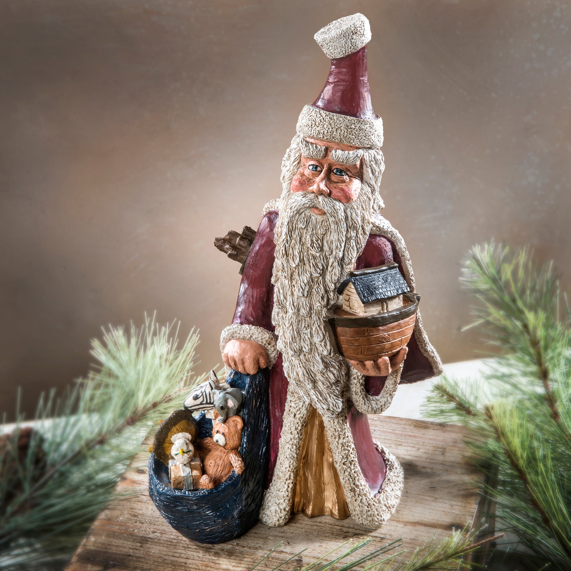 Add this unique Santa with Noah's Ark and a bag of stuffed animals to your holiday decor.