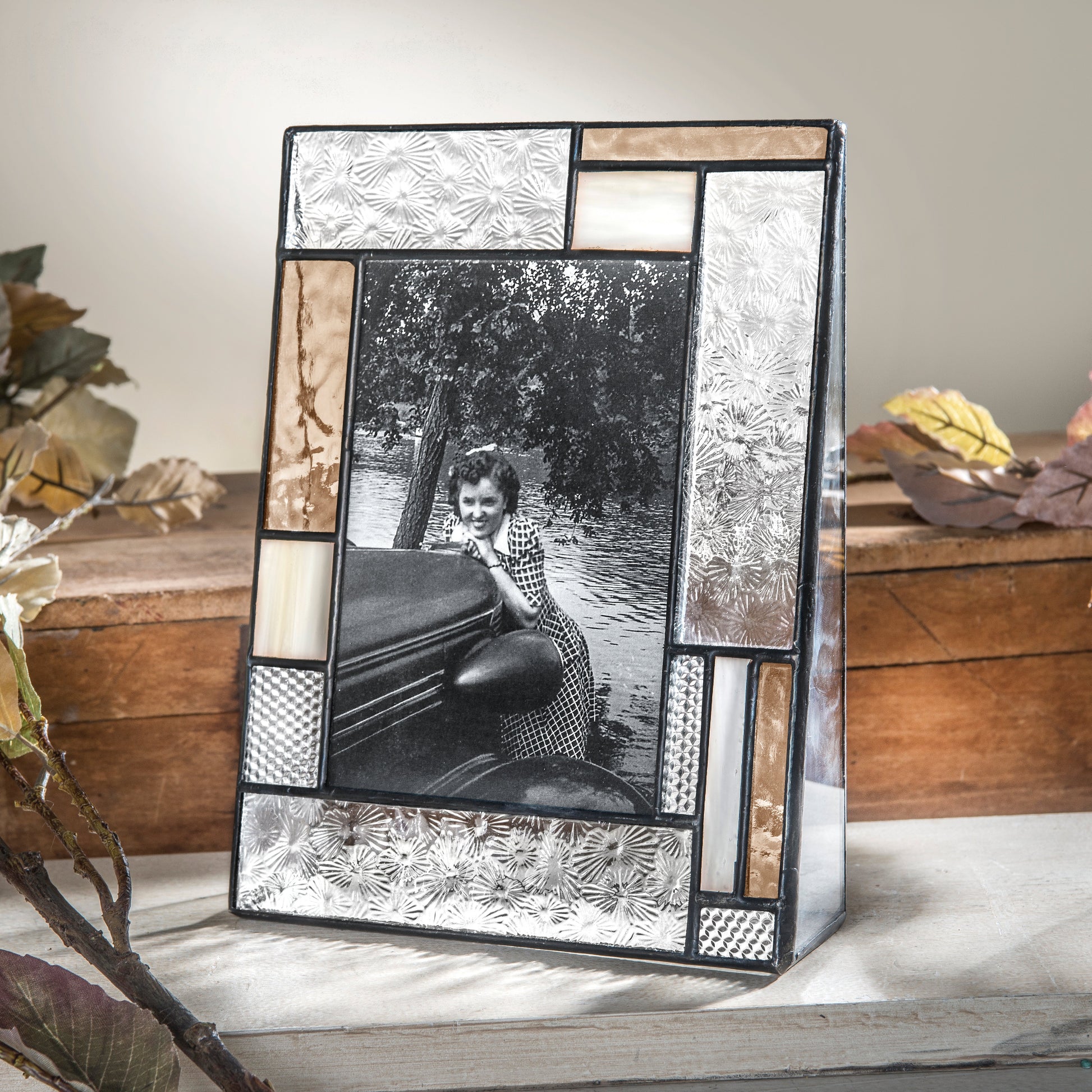 Using an arts an craft styling ivory opalescent, clear textures and a soft peach stained glass this picture frame fits easy into any home.