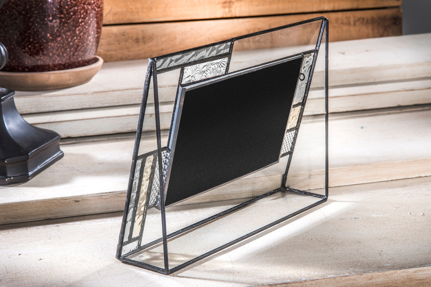 Metal trim and solder have been antiqued with a charcoal patina and waxed keeping the frame beautiful for years to come. Polish with a soft dry cloth.