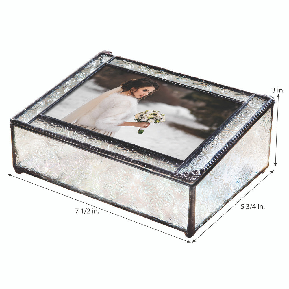 Add a vintage flare to any room with this delicate glass photo box from J. Devlin. Crafted using vintage-textured glass inspired by days gone by, balled feet, beaded edging, and an unexpected filigree corner, this glass box puts keepsakes close at hand. The lid houses a traditionally sized 4" x 6" photograph. Each stained glass box is carefully handcrafted by skilled artisans using a copper foil and solder technique developed by Louis Comfort Tiffany in the late 1800’s. This age-old art form combined with 21st century designs creates the perfect combination for unique home décor.