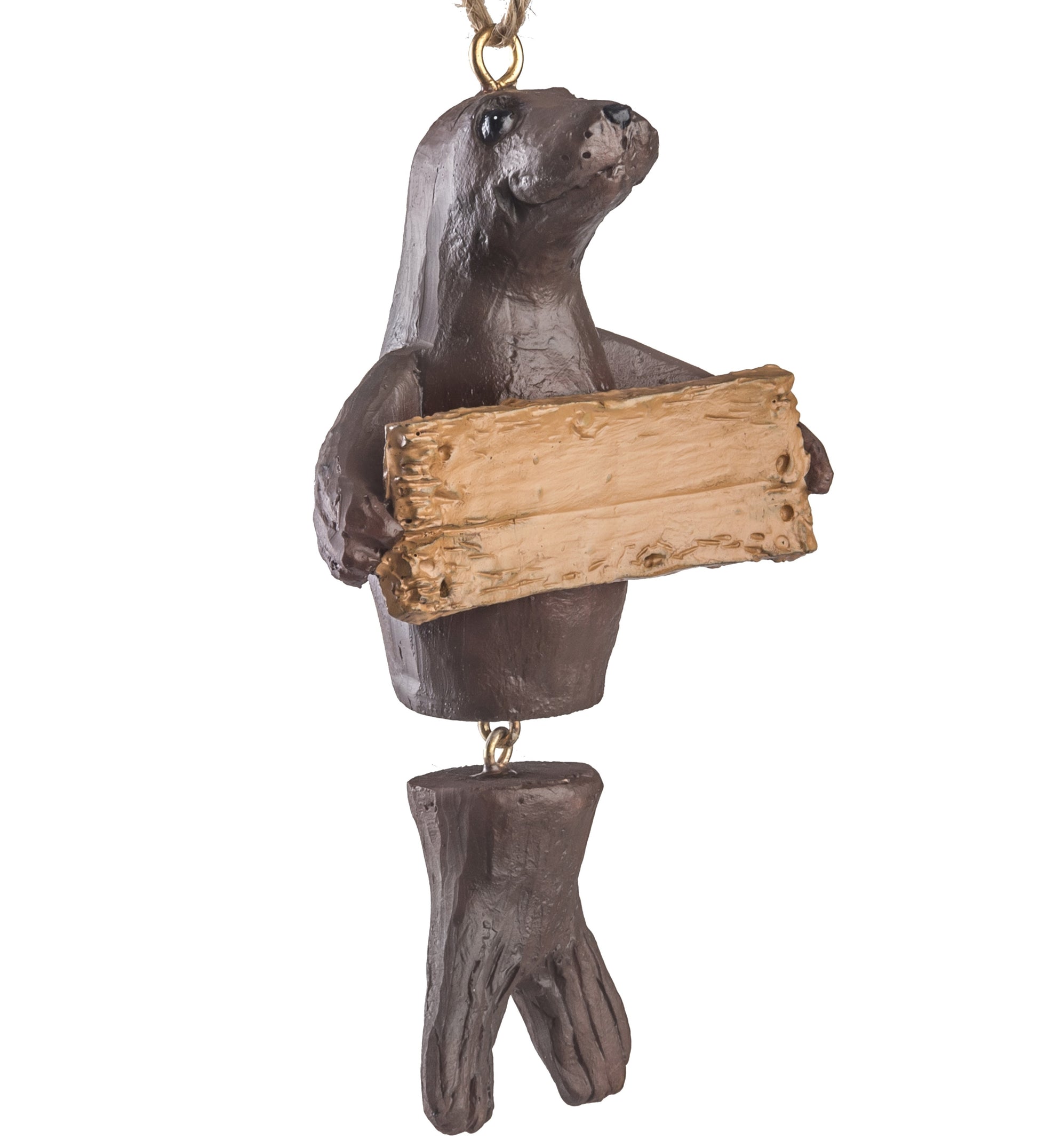 Make a splash this season with this playful seal! An original Bert Anderson design, this high-quality resin ornament features a blank sign for your custom name or beach destination and hangs from a rustic jute rope. A seaside favorite for coastal shops and aquariums. (Approx. 5" tall, not including hanger.)