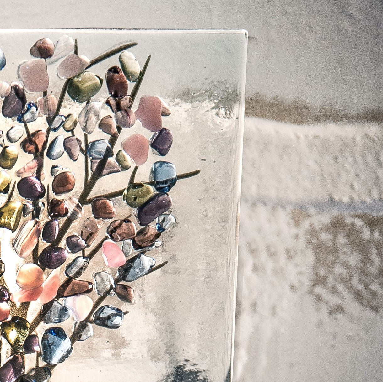 The colorful pieces are then fired in a kiln softening the edges and forming a permanent bond between the layers.