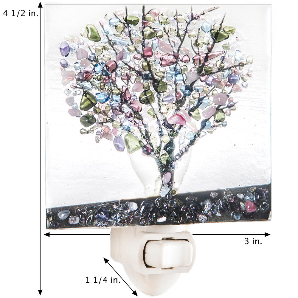 Bring a little outdoors into your bathroom, bedroom, or kitchen with this decorative night light. Or, use as an accent light in dark corners or hallways and enjoy the soft colors and subtle light. Strips and chips in shades of blue and purple give life to this tree that will keep it beautiful all season long.
