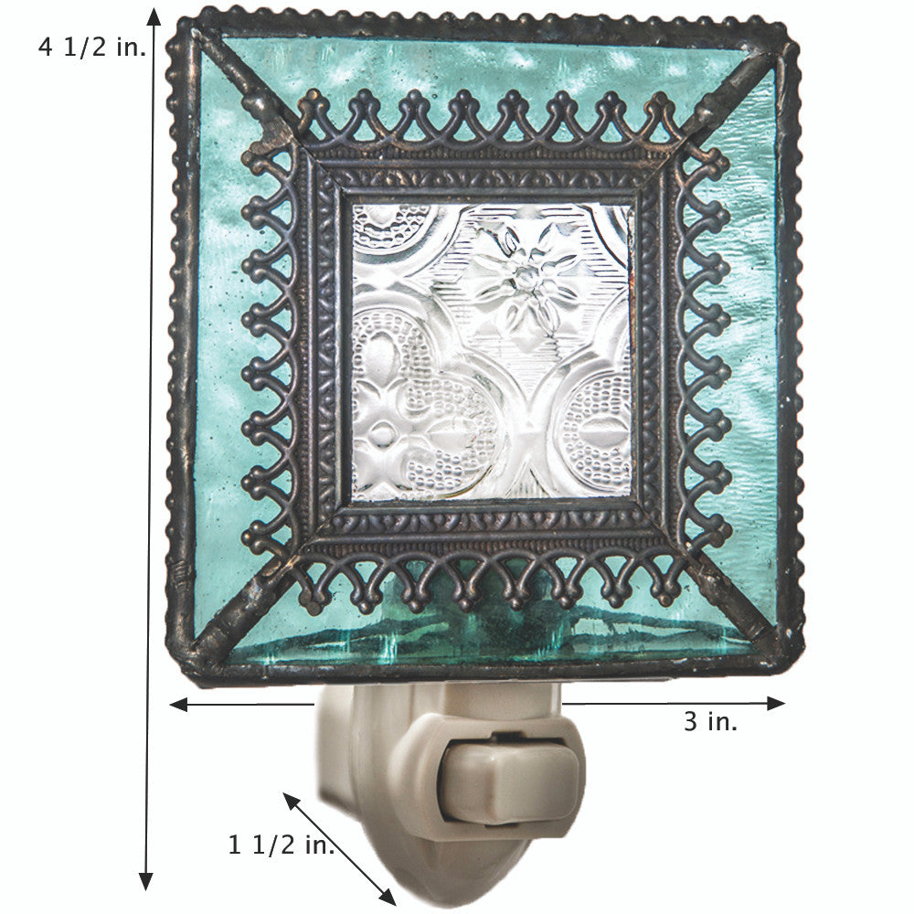 It features a soft turquoise blue glass that frames a clear vintage glass. Elegant filigree is laid on the seam between the two pieces of glass, further adding dimension and beauty. Dark beaded edging completes the look. This sophisticated glass home decoration is designed for use in any room or dark hallway.