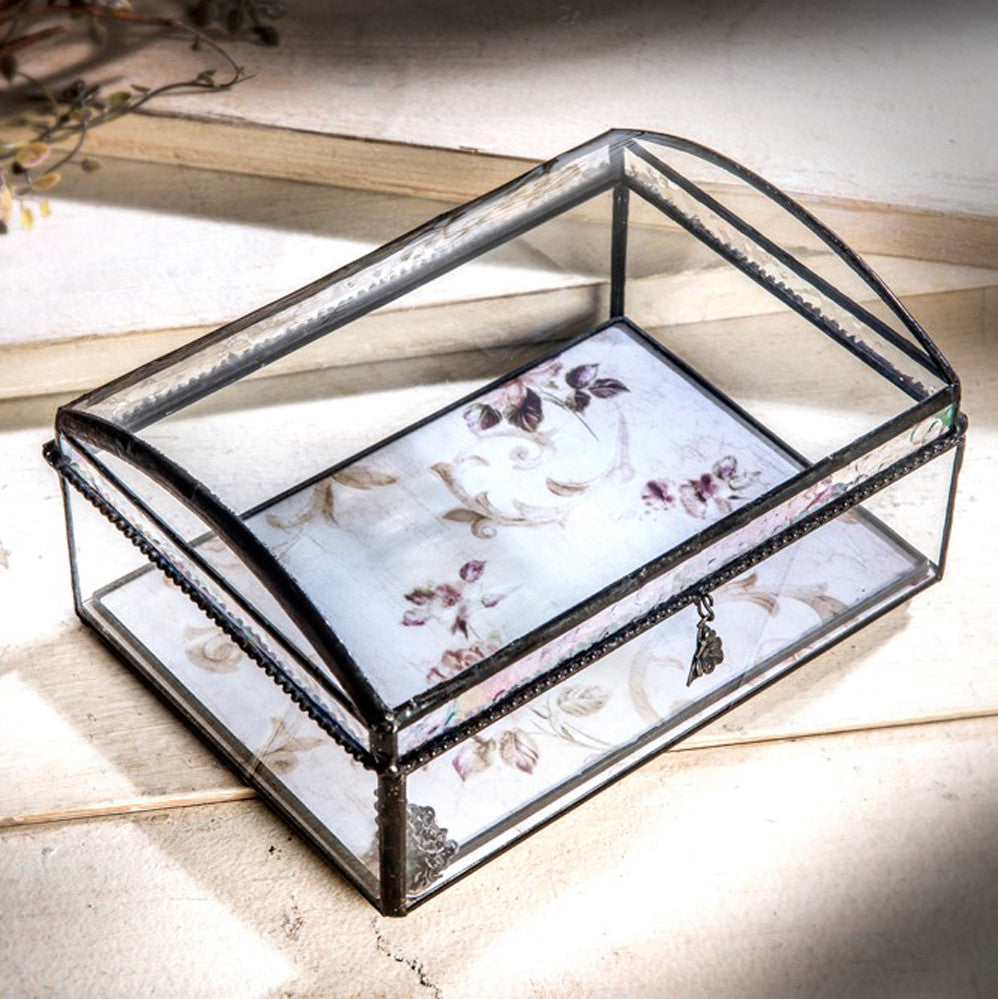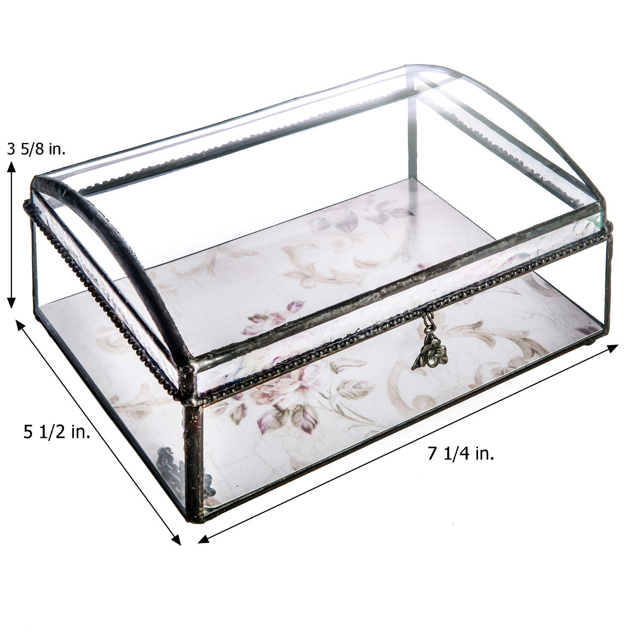 This glass box features a curved glass top with an iridescent glass trim and flower charm that dangles on the front.